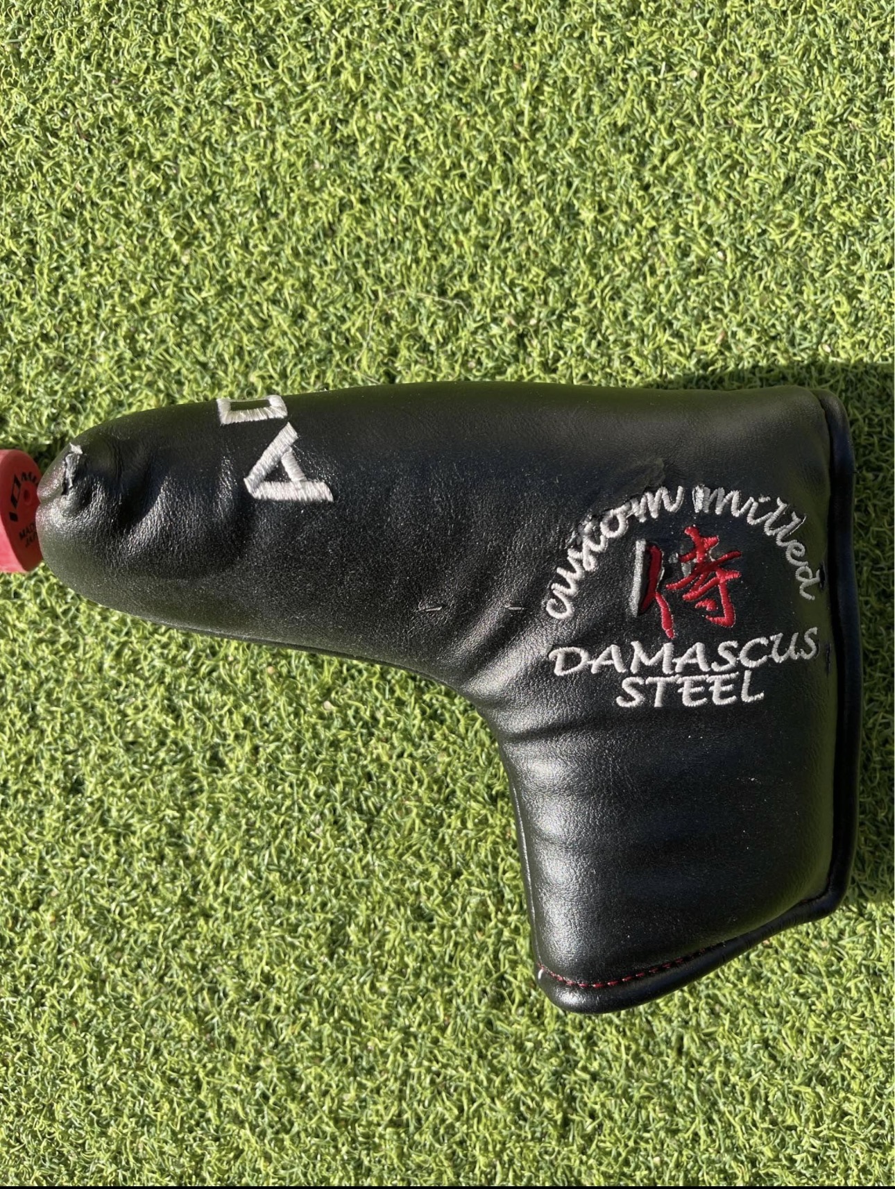 This is an extremely rare Damascus steel putter by Adams Golf. It was a limited production run. This putter has never seen play. The current shaft is by Fujikura, measuring 34 inches, with a special Ferrari-style paint job. The original shaft is included and measures 35 inches when installed. Both shafts have Iomic grips. Head cover showing signs of age. OBO, no trades.